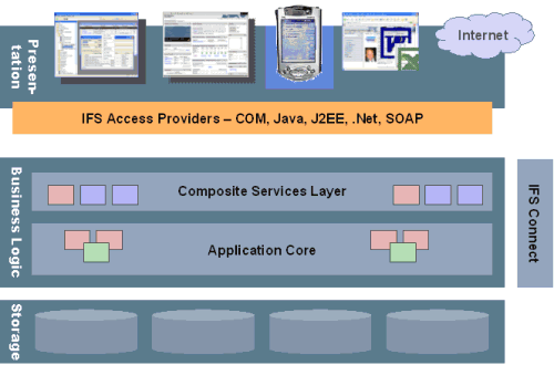 IFS Service-Oriented Component Architecture is a layered, multi-tier architecture. Each tier has its own job to do and does it in a standard way with a clear separation from, and interface to, other tiers. Each tier has its own software objects. These are all derived from a common design model but are implemented using different technologies to suit their purpose.