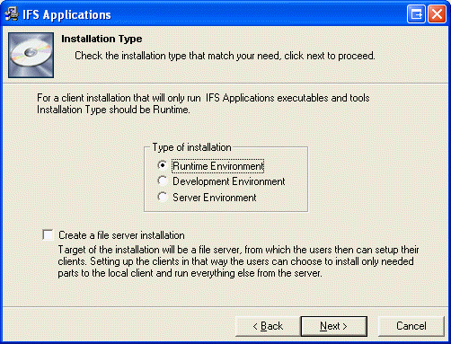 | Server Environment | Some components in IFS Applications run as “servers”, IFS Print Server is one example. This choice is much like the runtime environment but will only display server installation components. Choose this type when you are installing the IFS Print Server and similar parts of the IFS Applications. |
