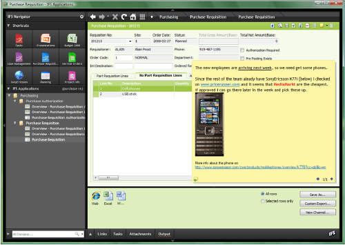 IFS Enterprise Explorer has been designed with both novice users and experienced super users in mind, and on the principle of “less is more”. This allows new users to quickly orientate themselves, and experiences users to discover additional features. Based on the familiar principles of a web browser navigation in IFS Enterprise Explorer has been made more intuitive, but also more powerful with new features like navigator filter, breadcrumbs, and visual recent screens. Finding information is easier and faster thanks to Google style keyword searching and a search dialog that is much easier to use and that automatically configures itself based on the users behavior. New innovations like rich media notes and a built in task handling system facilitate collaboration in context and information sharing between employees.