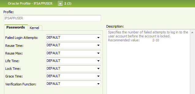 Resource limits is used to limit how much system resources a user (assigned to this profile) is allowed to consume. Note that these settings only have effect on normal users when connecting directly to the database from an external client. Database connections from IFS Application Server connect as IFS System User.