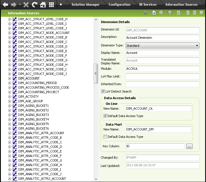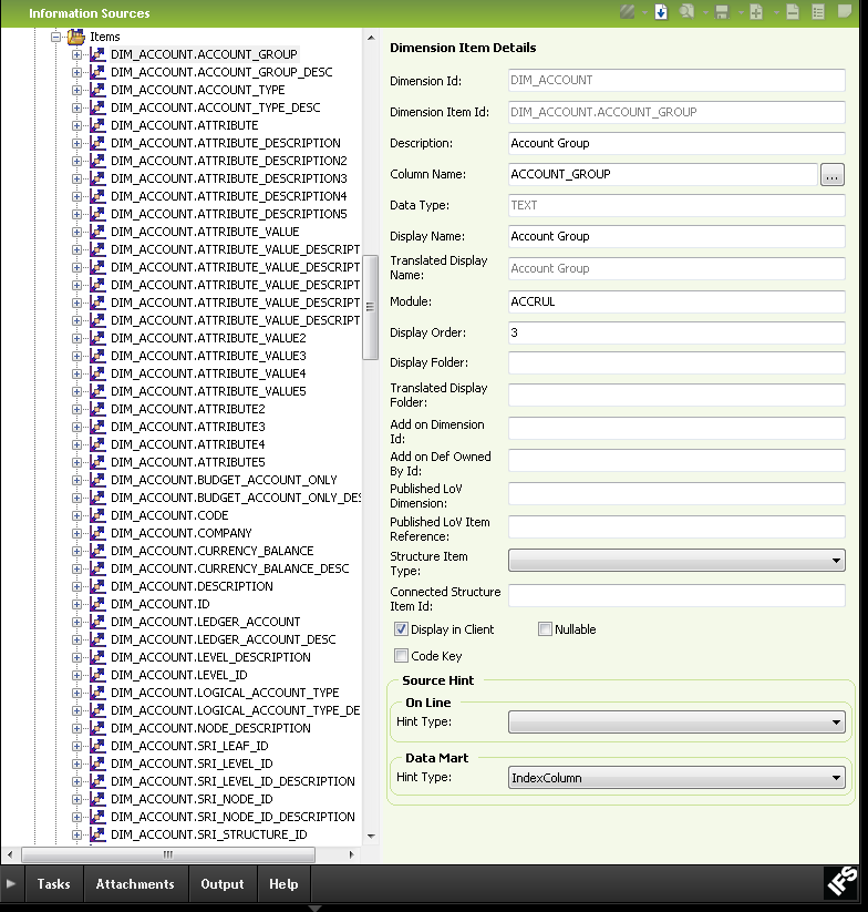 | Published LoV Dimension | Identity of the dimension that has a view that will serve as List of values view reference for List of Values support in Info Services for this dimension item. Normally only the Code Key item in each dimension supports List of values in Info Services. If some other item (than the code key item) should support List of Values then a supportive dimension must be defined and then registered as PublishedLovDimension |