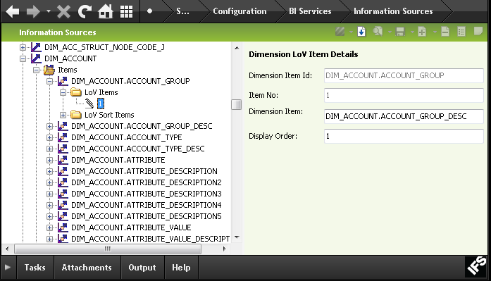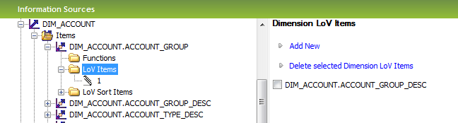 For a given dimension, expand the dimension node, next expand the Items node, expand a dimension item node, then expand the LoV Items node to see all associated LoV items. Selecting one of these items will display the detail information for that specific associated item.
