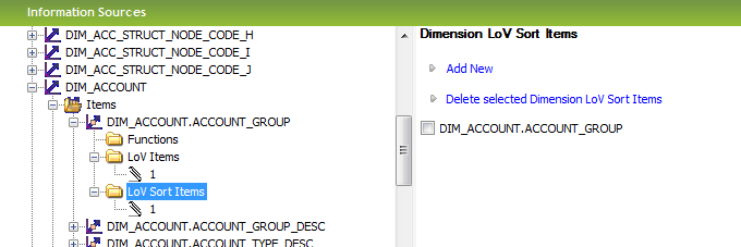For a given dimension, expand the dimension node, next expand the Items node, expand a dimension item node, then expand the LoV Sort Items node to see all sort items related to LoV of the selected dimension item. Selecting on of these items will display the detail information for that specific sort item.