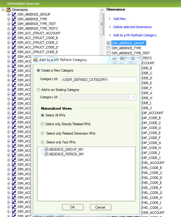 Use the operation Add to a MV Refresh Category to add all Materialized Views associated with a Dimension to a specific refresh category. It is possible to add the Materialized Views to a new refresh category or to an existing category. Selecting Materialized Views is supported by the following options: