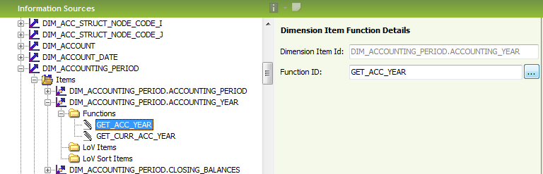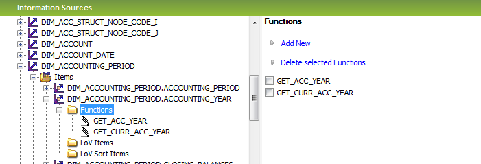 Dimension Functions operations available after clicking on the Functions node of the selected Dimension item in the tree structure are listed below.