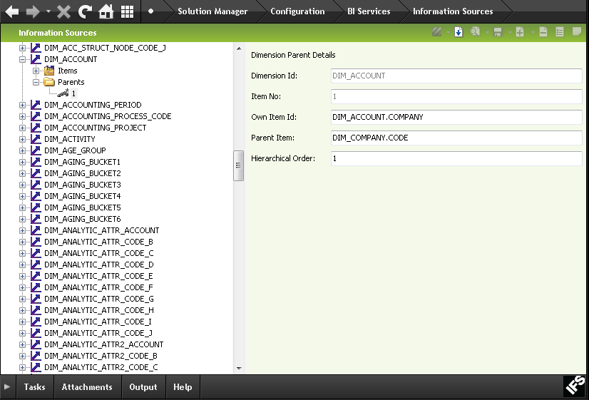 For each dimension it is possible to define parent dimension items. This information is used mainly by the List of Values functionality. Parent information for dimensions always means specifying one or more dimension items that have to be available to enable an accurate List of Values of dimension items. The main difference compared to List of Values for Information Sources is that we also have to define a dimension identity in the dimension itself that corresponds to the parent value supplied in the client.