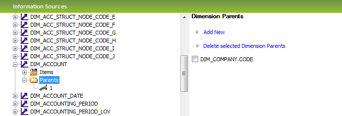 Expanding the navigator for a specific Dimension and then expanding the Parents node will display all parent specific dimension items. By selecting one of these items in the navigator, the parent dimensions item details will be displayed.