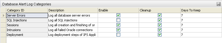 The Database Alert Log makes it possible for system administrators and installation technicians to trace different activities in the database. It is possible to turn on or off every Database Alert Log Category independent of each other. To do this open the Database Alert Log Categories form in Solution Manager / Monitoring folder in the Navigator.
