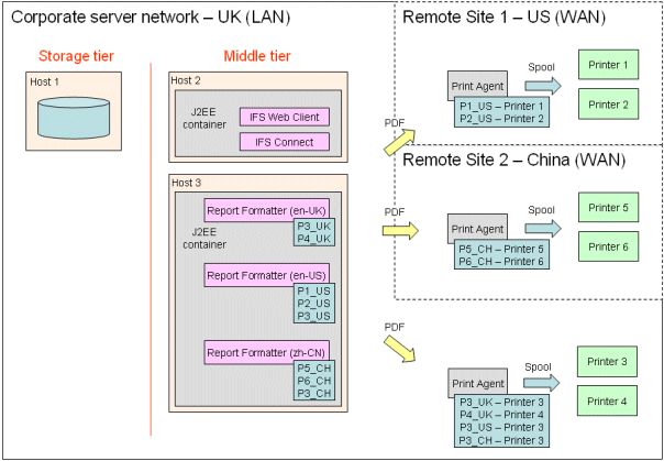 The Report Formatters should still be kept centrally since they interact heavily with the database. But since it's far more effective to send a PDF document over the WAN compared to spooling the print job the Print Agents should be installed on site.