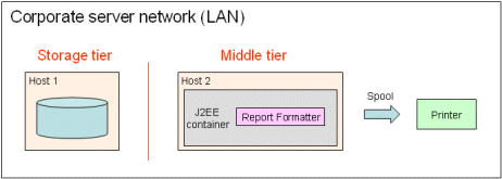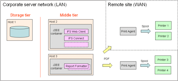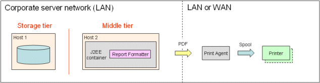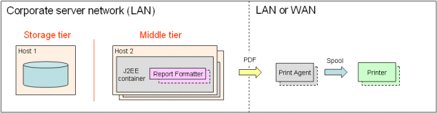 The picture below shows an overview of the architecture. The middle tier is where the Report Formatter(s) reside. The Report Formatter will fetch print jobs and report data from the storage tier and process/render these print jobs into PDF documents. These documents are stored in the database and used to both preview and print the report. The actual printing of the formatted PDF document is handled by the Print Agent. The reason for separating these steps is that the printer(s) might be located on a different LAN (local area network) connected to the central LAN through a WAN (wide area network) connection. The spool jobs sent to the printer(s) are significantly larger than the PDF document(s), so this is a performance optimization that reduces the network load. The other reason for moving the printing outside the J2EE application server is that the printing is a native task (non Java) and as such it could render the J2EE application server unstable if terminated unexpectedly. For convenience there's a Print Agent built into the Report Formatter, but this is only for demo and development purposes. In a production environment there should always be at least one separate Print Agent installed.