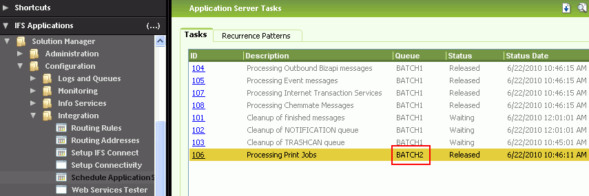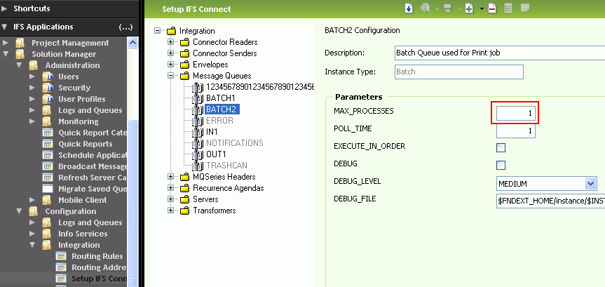 In order to enable parallel processing of print jobs, the number of threads in which a certain Report Formatter executes needs to be configured. A Report Formatter is technically implemented as a background job in IFS Connect. The way to configure the number of reports that can be formatted simultaneously by one singe Report Formatter is to configure the number of threads of the queue in which it executes. If several background jobs and/or Report Formatters share the same queue the number of threads will be shared. The easiest way to control this is to make sure each Report Formatter executes in it's own queue. This is all controlled by managing what queue the background job / Report Formatter is executed by and setting the number of maximum processes for that queue, as shown below.