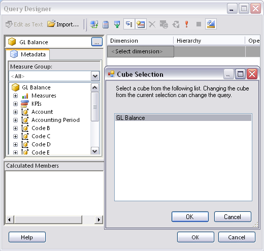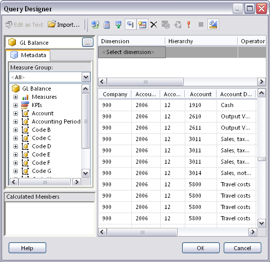 Figure 2: Query Designer window with the dataset from the cube