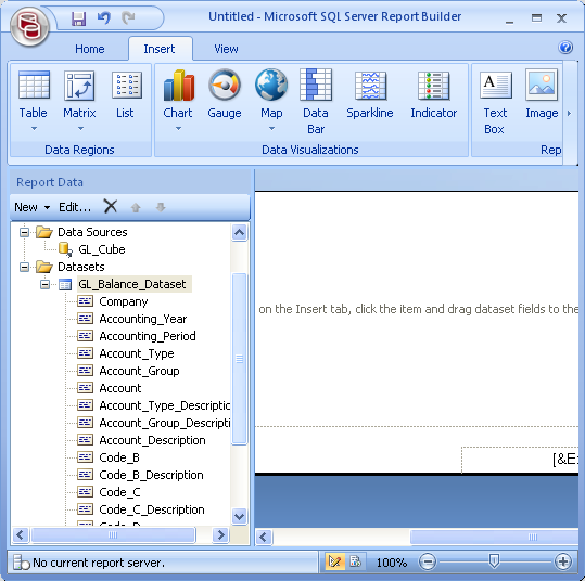 Select the newly added GL_Cube data source, in the Report Data pane, right-click and click Add Dataset to open the Dataset Properties dialog box.