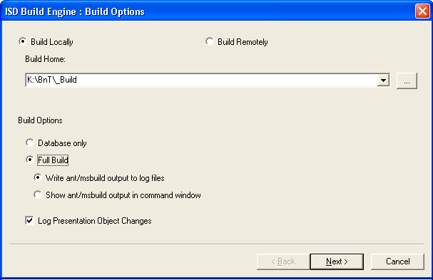 If you choose the option to 'Build Locally' you should provide the path to Build Home. If the build home is on a network share you need to map it first. Build Home combo box will show all build homes available for all customer installations. If you choose 'Build Remotely' you should provide the Build URL.