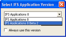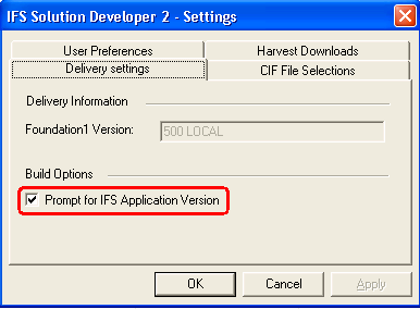 Option in following Delivery Settings dialog can be used to enable/disable prompt for IFS Application version.