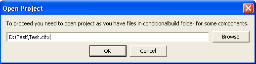 If project file is not opened and delivery has files in 'conditionalbuild' folder for some components it will popup following dialog. This is to fetch correct deploy.ini files which will be used by the Configuration Builder to identify the destination locations of the files in conditionalbuild folder when creating build structure.